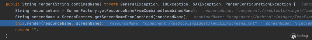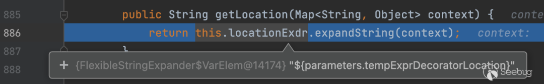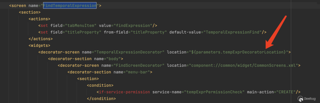 指向的TempExprScreens.xml配置文件中可以看到,通过parameters参数传递tempExprDecoratorLocation作为location的值,后续会用到这个值,如图7所示。