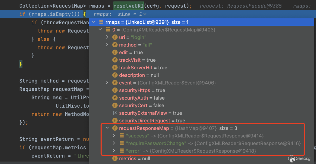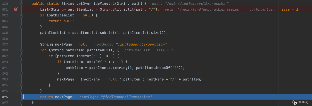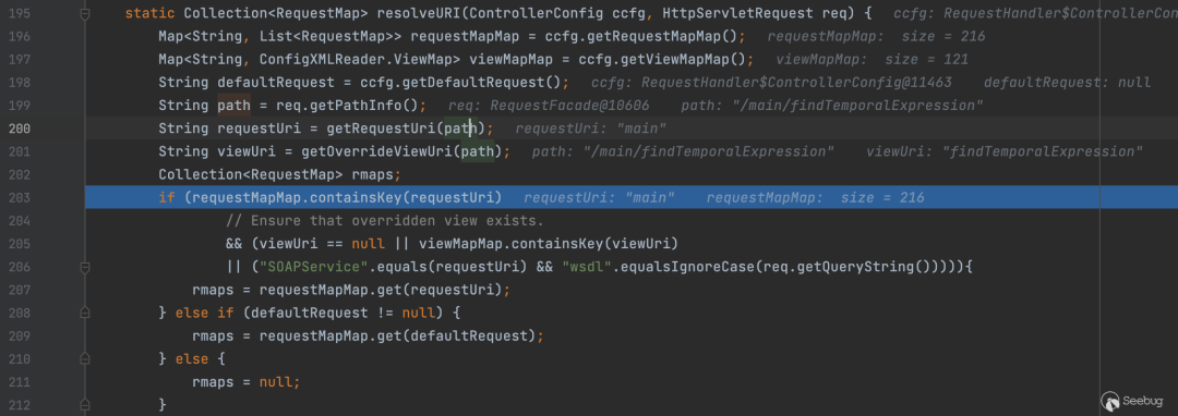 以/webtools/control/main/findTemporalExpression 举例,访问并断点RequestHandler#resolveURI的处理逻辑如图1所示。