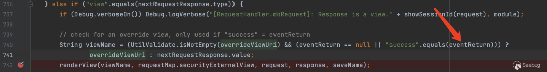 接着根据返回值,传递给eventReturn,再通过eventReturn值来确定renderView函数传递的viewName是overrideViewUri还是nextRequestResponse.value,overrideViewUri也就是前面提到的getOverrideViewUri方法获取的值,如图5所示。