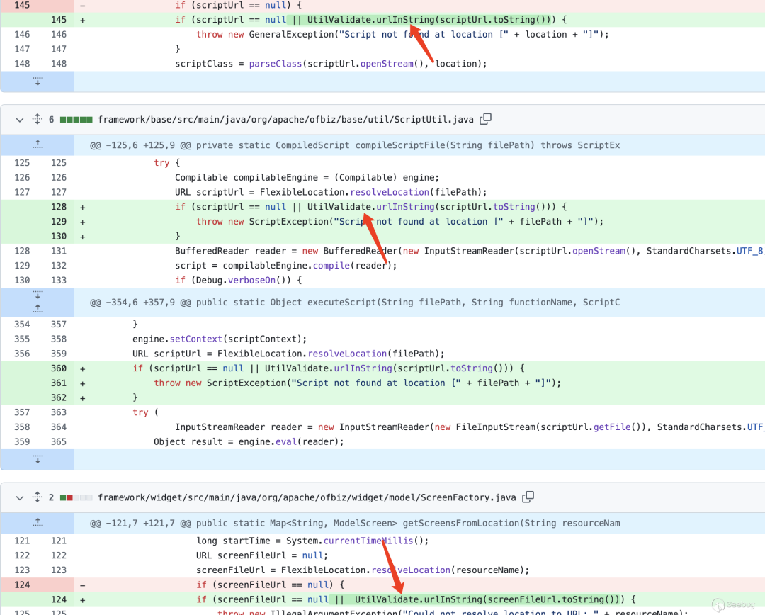 1、https://github.com/apache/ofbiz-framework/commit/28f5f87ec9,对location进行校验,如图13所示。