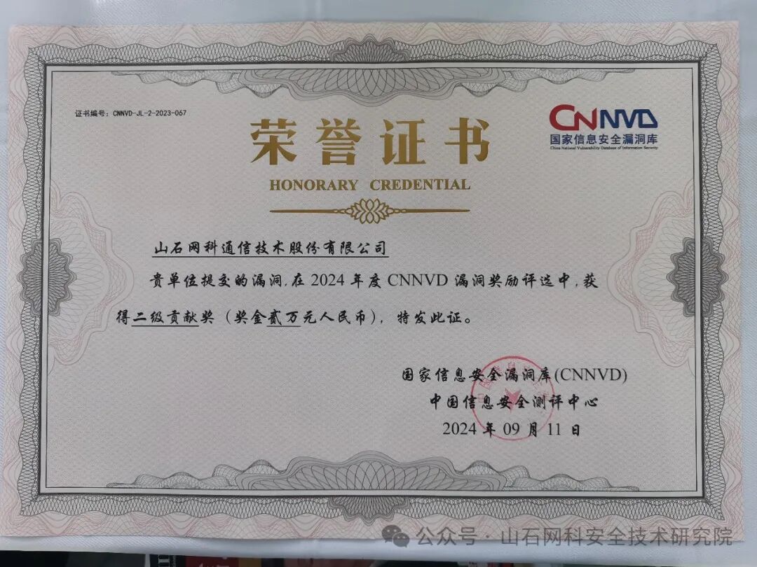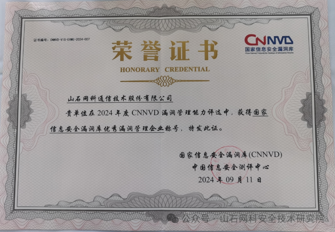 2024年度国家信息安全漏洞库优秀漏洞管理企业奖