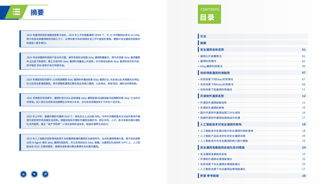 随着新兴技术的飞速发展,网络安全漏洞的形态和利用手段也在不断演变,网络安全挑战日益严峻。本报告从网络安全漏洞总体视角出发,统计全球漏洞数据,分析2024上半年漏洞发展态势与流行利用趋势;并围绕攻防场景中的漏洞利用新变化、国内外开源软件漏洞发展新趋势、以及人工智能对漏洞利用与防御的影响三大角度展开分析,希望能够为网络安全行业提供有效参考。