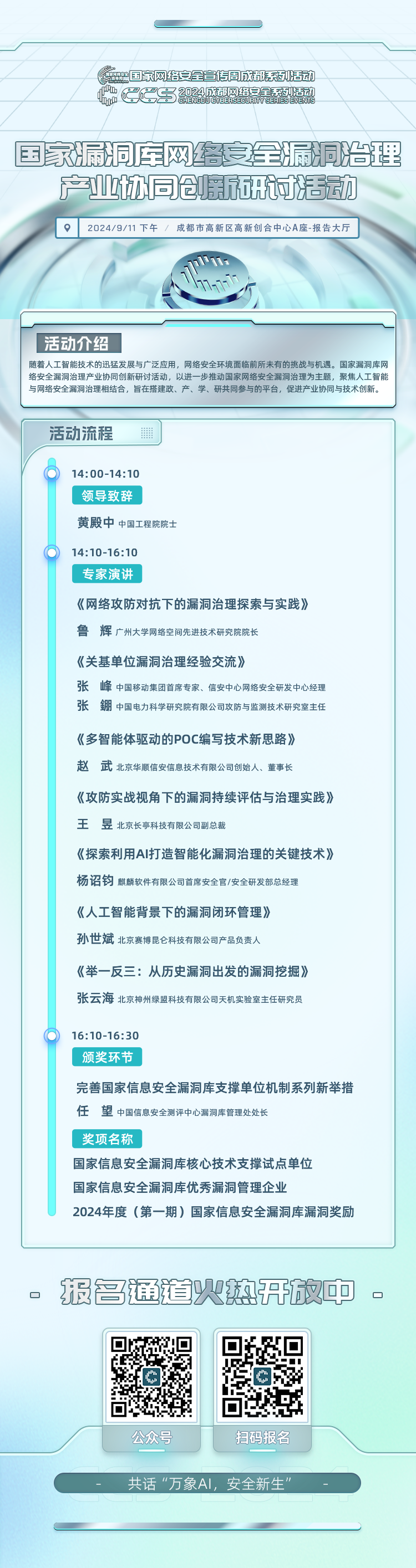 报名开启 | CCS 2024成都网络安全系列活动——国家漏洞库网络安全漏洞治理产业协同创新研讨活动