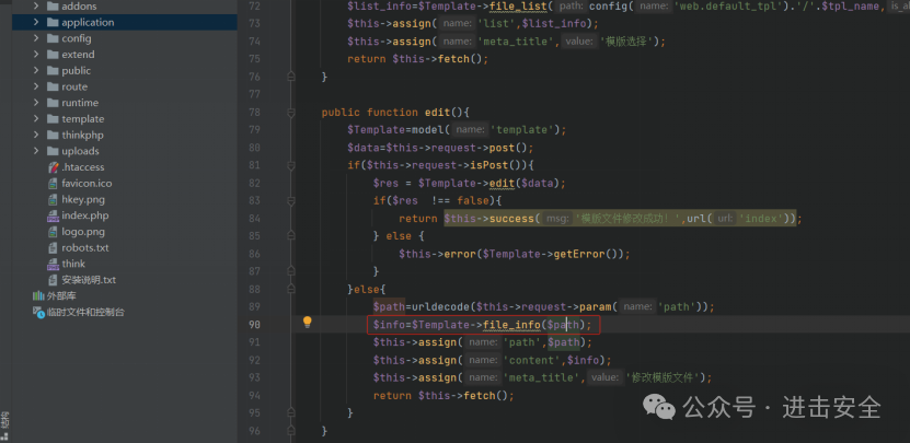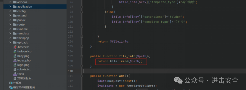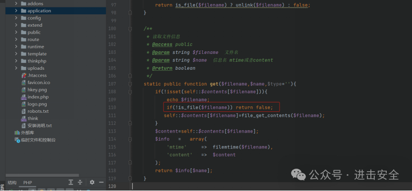 首先这个代码是一个ThinkPHP框架开发的一个项目,在代码当中可以看到第110行代码当中存在一个is_file方法,这个方法是进行判断xx文件是否存在。