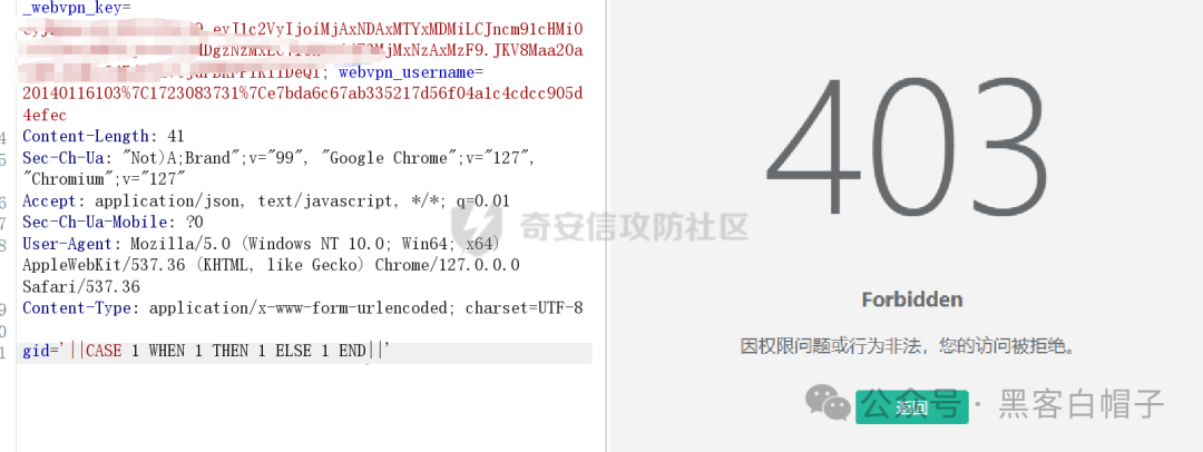 试了下orcale的注入方法,又爆403,这里’||55||’会返回空数据,’||1/0||’会爆500,这里判断语句能想到的都试了,全403,最奇怪的是只有语句正确才会403,少写一个D就会500,不知道这什么匹配逻辑,不过试了一些插入空白字符啥的也都不行