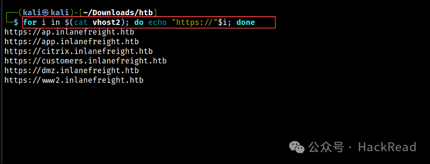 识别虚拟主机后,我们附加 HTTP 或 HTTPS 以生成 URL 列表。我们可以使用单行 bash 脚本来做到这一点。