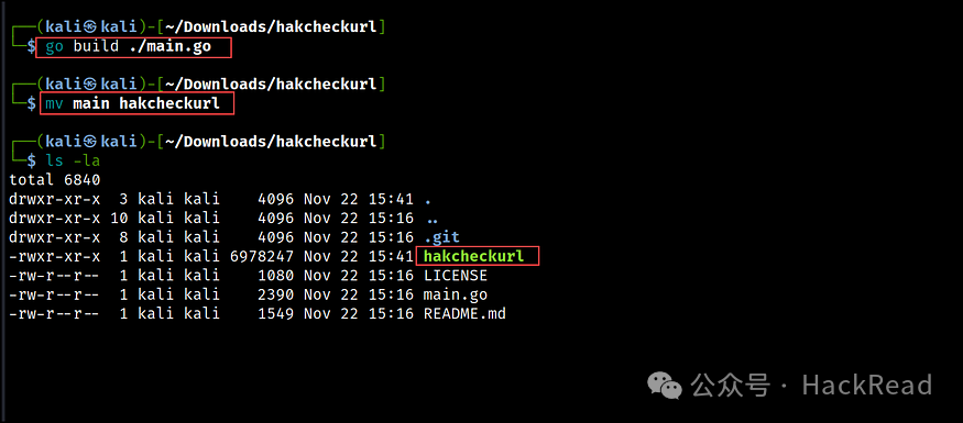 安装后,克隆 hakcheckurl 存储库,使用go build构建该工具,并将其重命名为 hakcheckurl。