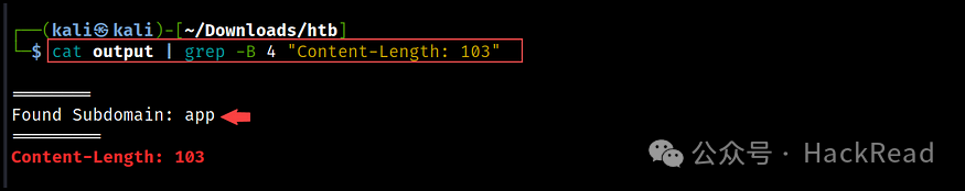 模糊测试完成后,我们将输出保存到文件中。然后,我们可以使用“ grep ”在结果中搜索文本中包含单词“ FUZZ ”的行。下面是使用 grep 查找具有已识别子域的行的示例。