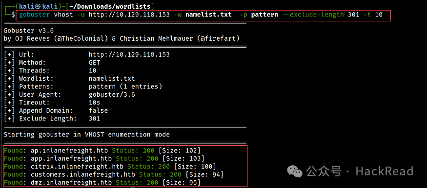 gobuster vhost -u http://10.129.118.153 -w namelist.txt -p pattern --exclude-length 301 -t 10