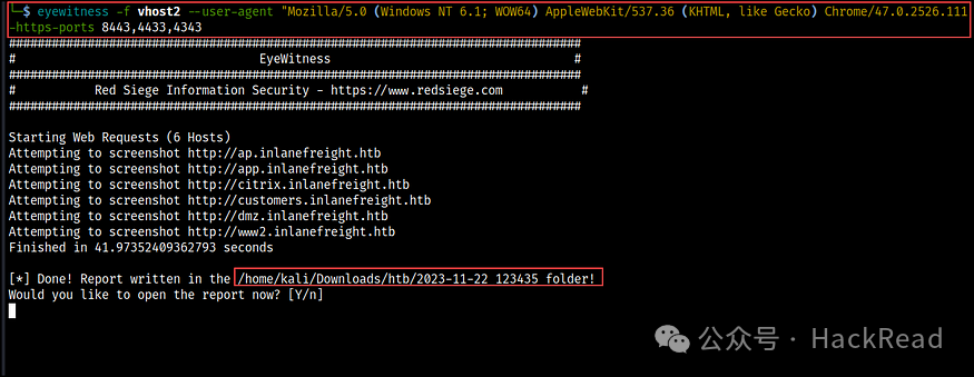 我们还可以使用–add-http-ports和–add-https-ports标志指定其他端口来检查 http 和 https 协议。这指示 Eyewitness 连接到这些端口并捕获屏幕截图(如果适用)。