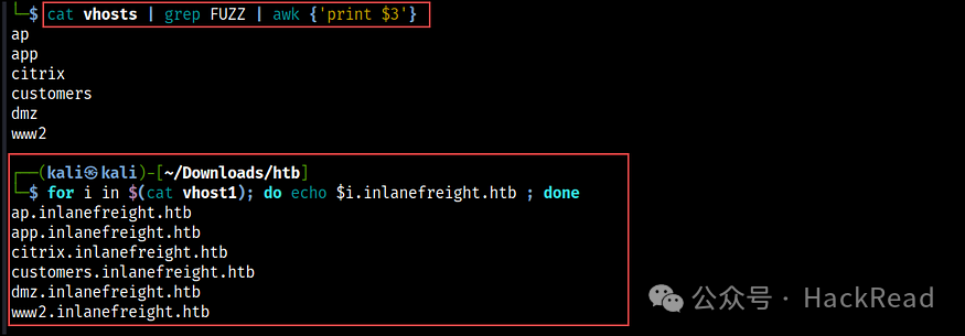 使用简短的 bash 脚本,我们将原始域名附加到已识别的子域中,如图所示。