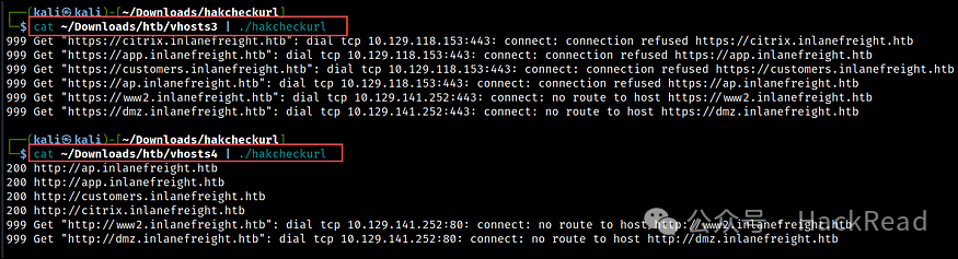 接下来,我们使用 hakcheckurl 工具确定每个 URL 的 HTTP 响应代码。在下面的结果中,我们注意到使用 HTTPS 协议的 URL 无法访问,而使用 HTTP 协议的 URL 返回了 200 个响应代码。这表明使用 HTTP 的网页已启动并正在运行。