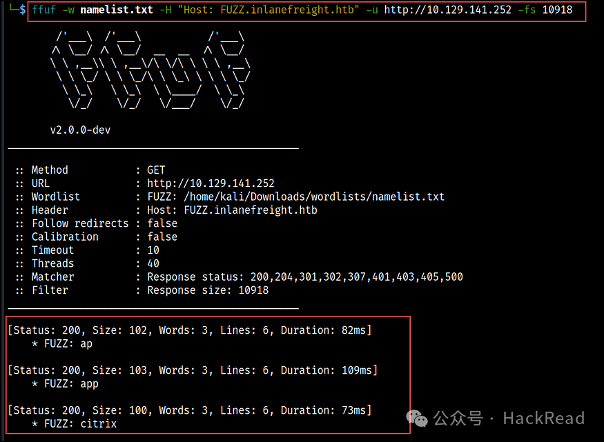 然后,curl 命令向指定的 IP 地址 (http://10.129.141.252) 发出 HTTP HEAD 请求,并传递 Host 标头中单词列表中的子域。