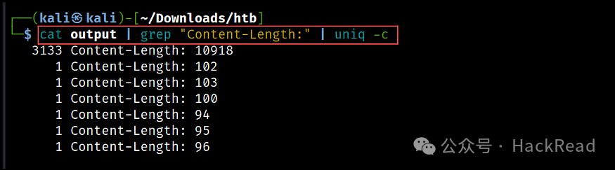 为了搜索输出,我们再次使用 grep 命令并过滤包含文本“Content-Length:”的行。然后,我们使用uniq命令删除文本文件中的任何重复行,并使用-c标志来计算每个唯一行出现的次数。