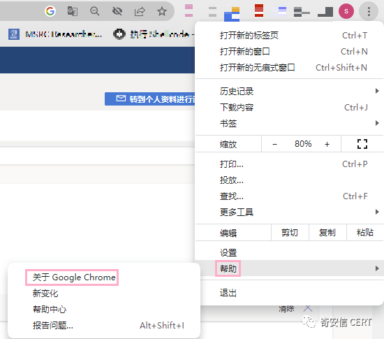 1. 查看右上角的“更多”图标,选择帮助 -> 关于Google Chrome