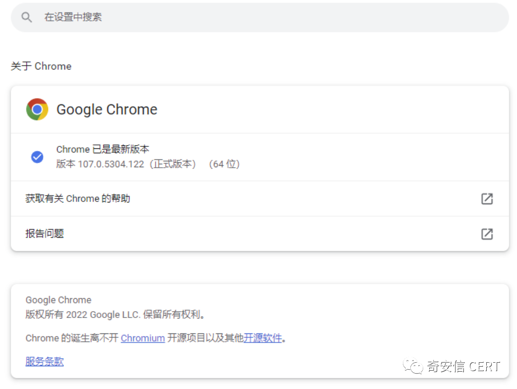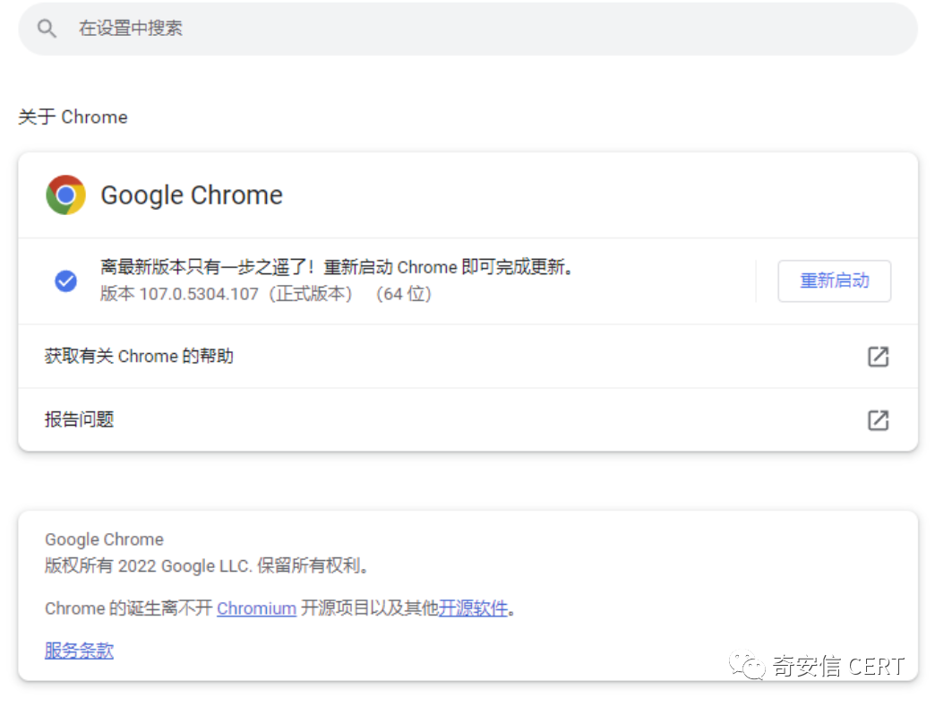 ,Google Chrome已发布新版本(Google Chrome for Mac /Linux 107.0.5304.121、Google Chrome for Windows 107.0.5304.121/.122),建议用户尽快升级至最新版本。