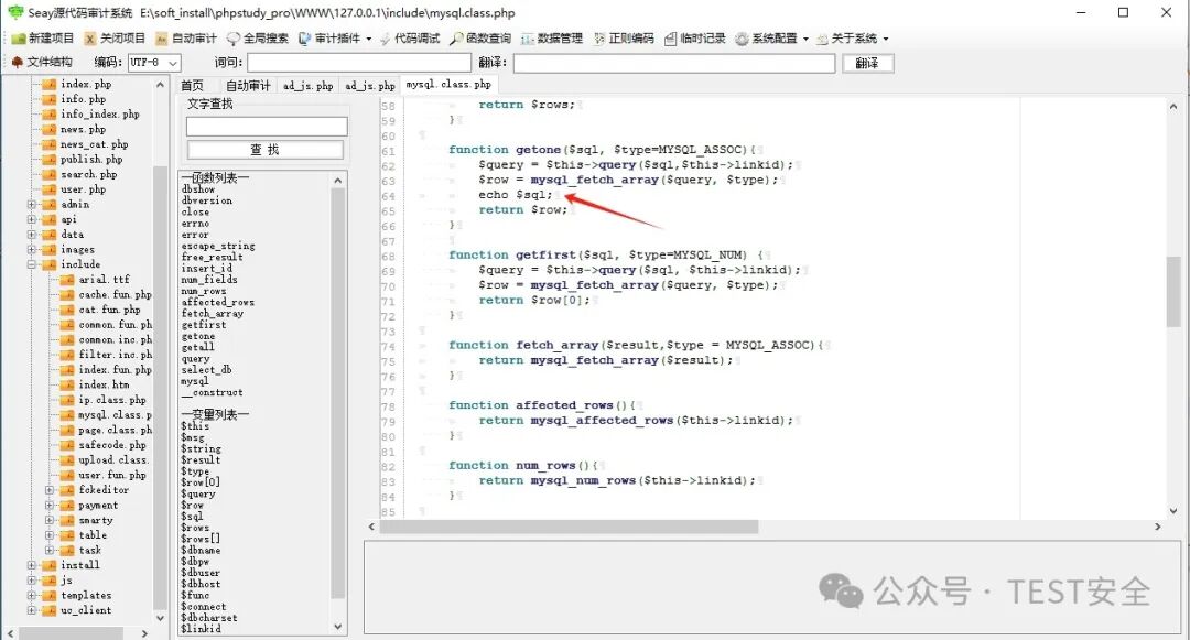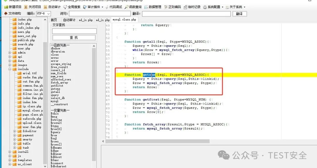 通过查找文件发现getone方法在/include/mysql.class.php里面,查看函数声明