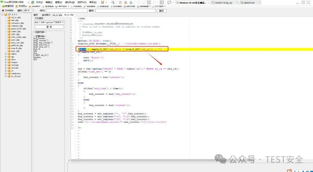 ad_js.php中有变量$ad_id,这种情况就可以优先看,因此此时变量直接拼接在where列名(ad_id)之后。在注入时,大部分的注入语句都是在while后面的一个变量,通过跟踪那个变量值来注入。像上面的变量写在order by后面的就不一定能注入成功
