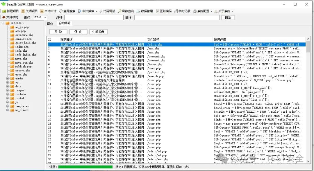 接下来我们使用seay新建项目,使用Seay进行自动审计,但这个分析只是单一的静态分析里面的代码和函数可能出现的漏洞