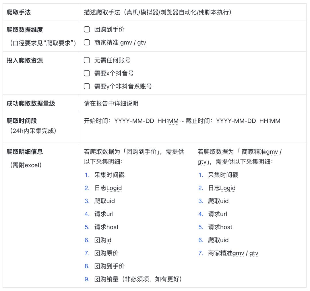 请按照如下格式提交,并要求录制爬取过程中的一段屏幕视频(日期、账号、脚本执行过程、不小于100条获取数据)用于内部验证爬取有效性,需提交内容包括但不限于:
