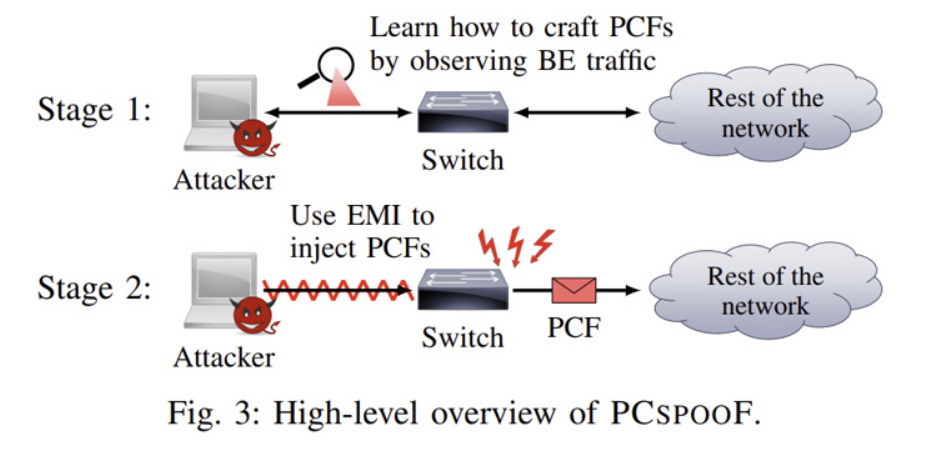 反过来,这可以通过使用恶意设备经由以太网电缆向TTE交换机注入电磁干扰(EMI)来实现,实际上欺骗交换机发送看起来真实的同步消息(即协议控制帧或pcf),并使它们被其他TTE设备接受。