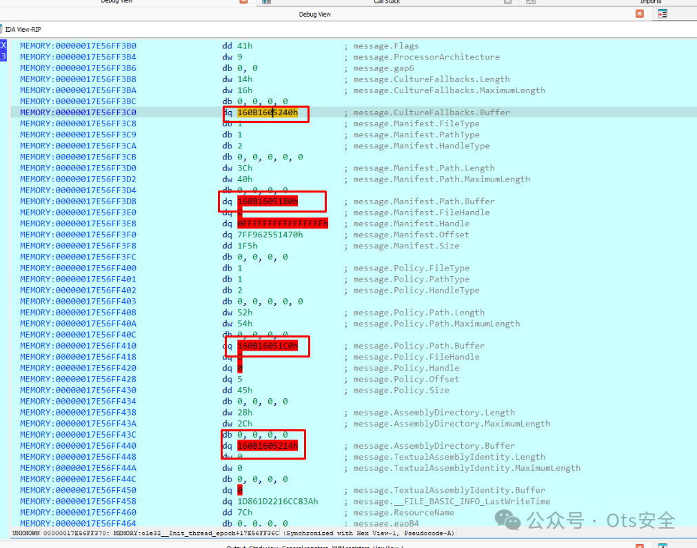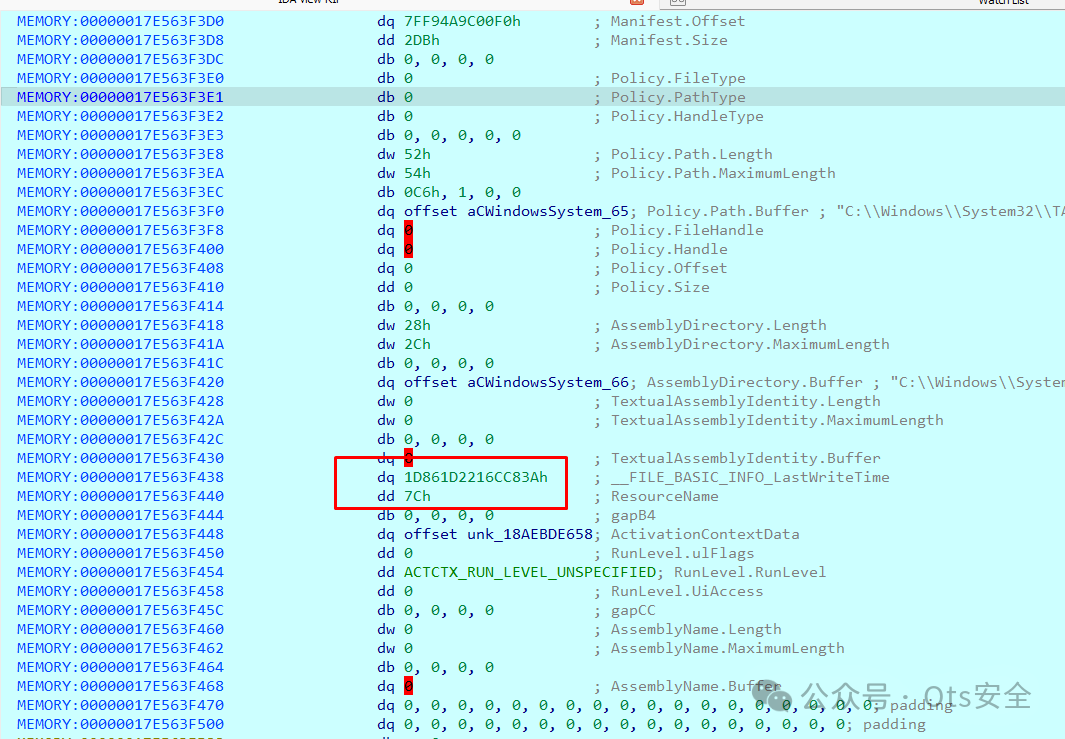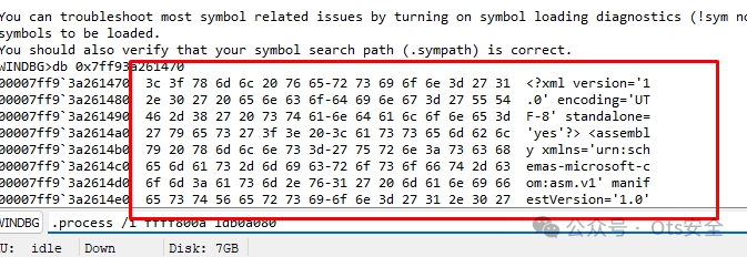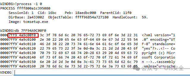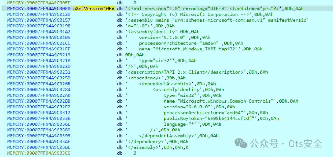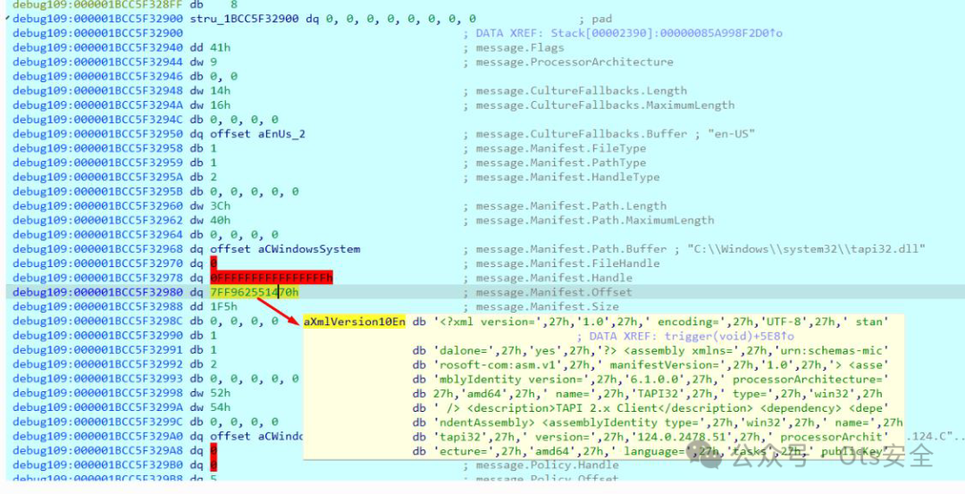 将上下文更改为TCMSETUP过程,可以看到Manifest.Offset值指向某些嵌入的 XML 清单。