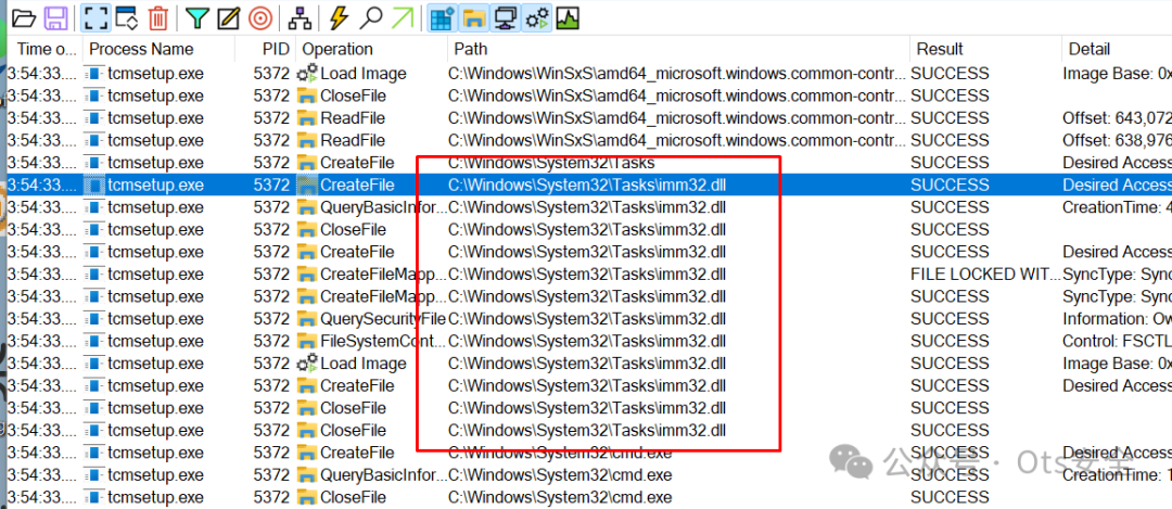 可以使用PROCESS MONITOR来验证TCMSETUP是否从“ tasks ”文件夹加载IMM32.dll。