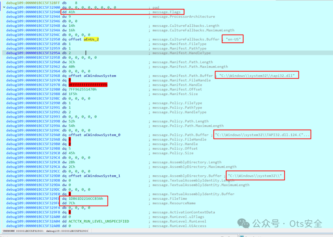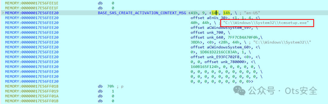 从_BASE_SXS_CREATE_ACTIVATION_CONTEXT_MSG结构开头向上扩展0x40字节,分配TotalMessage结构。请求TAPI32.dll的进程的 PID是TCMSETUP,因为它要加载 DLL。