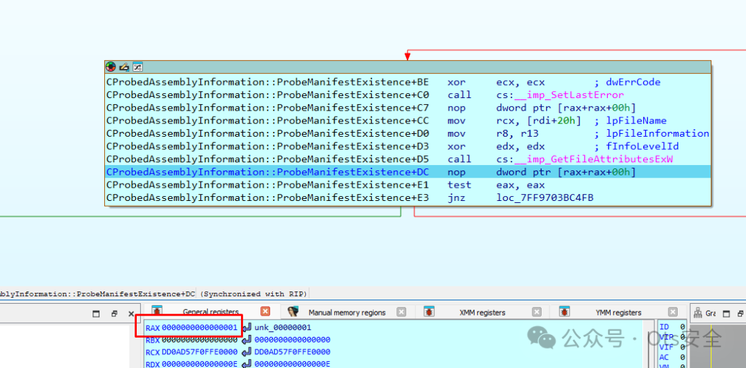 接下来,它使用GetFileAttributesExW检查SXS txt 日志中提到的第一个文件是否存在。由于不存在,因此它返回零。