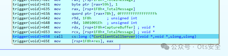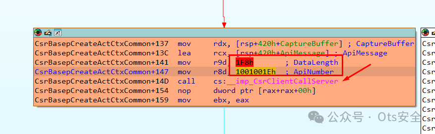 为了到达激活服务器,CsrClientCallServer函数将从我的MsCtfMonitor.dll发送我的数据包,其 ApiNumber 为0x1001001E,与上面提到的旧漏洞利用程序相同。