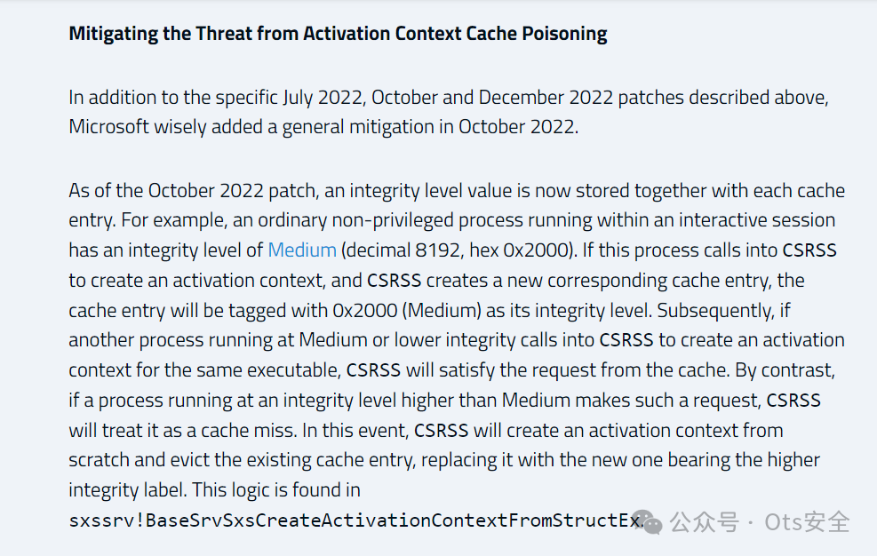 实施此补丁后,仅当在缓存中添加新条目的进程具有与将使用该条目的进程相同或更高的 RID 时,才可以绕过注册激活上下文 (ACTX)时的检查。