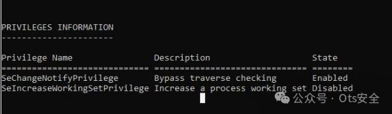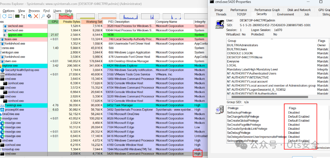 同时,我们可以证实,尽管该进程处于高完整性级别,但没有管理员权限: