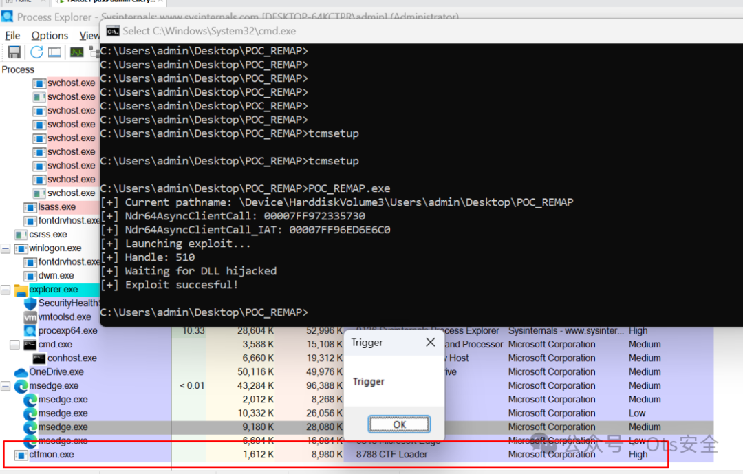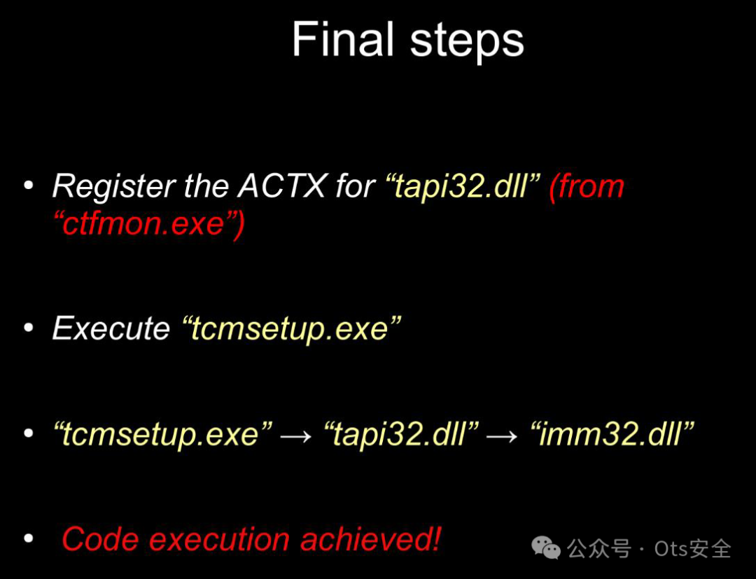 从那里我们可以从控制台运行TCMSETUP.EXE ,尽管我的 PoC在激活缓存中毒完成后从MsCtfMonitor.dll执行 TCMSETUP: