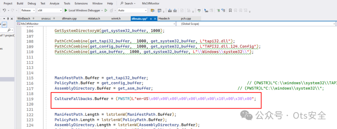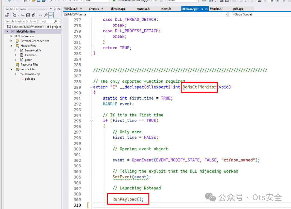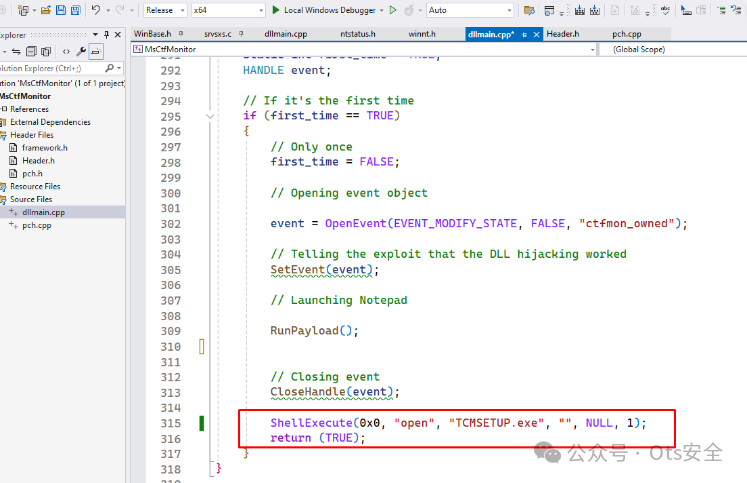 通常,它会尝试从真实的 system32 文件夹加载名为MsCtfMonitor.dll的模块,但由于 ROOT 驱动器已被重新映射,它会在我们伪造的 system32 中查找MsCtfMonitor.dll,我们可以在其中创建并放置一个具有相同名称的精心设计的 DLL。
