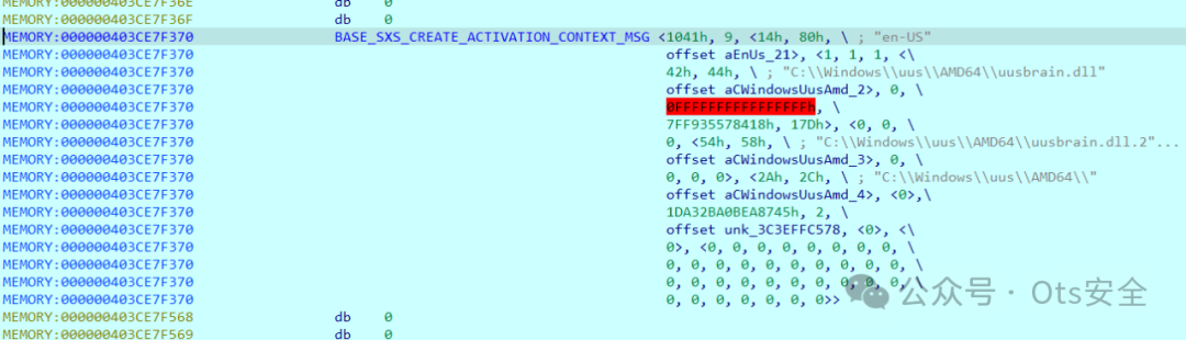 在初始的 0x40 HEADER字节之后(由系统填充一些值,如客户端进程的 PID 等…),可以看到属于_BASE_SXS_CREATE_ACTIVATION_CONTEXT_MSG结构的激活消息: