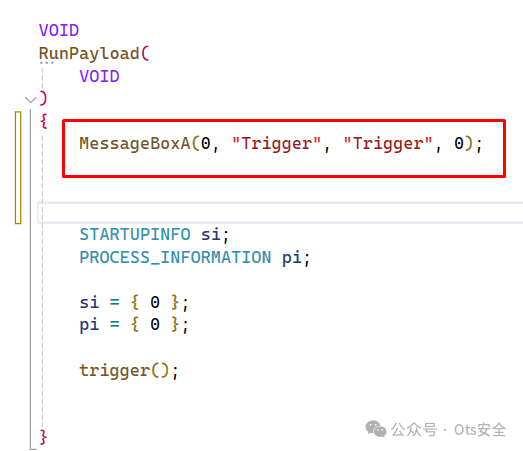 4.在DoMsCtfMonitor函数上放置一个MessageBoxA,当MsCtfMonitor.dll被加载时,它会显示MessageBoxA “TRIGGER”。