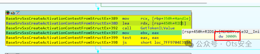 之后,它会获取调用进程的 RID 并存储起来以供进一步比较。在本例中,由于CTFMON具有高完整性级别,因此 RID 为0x3000 。