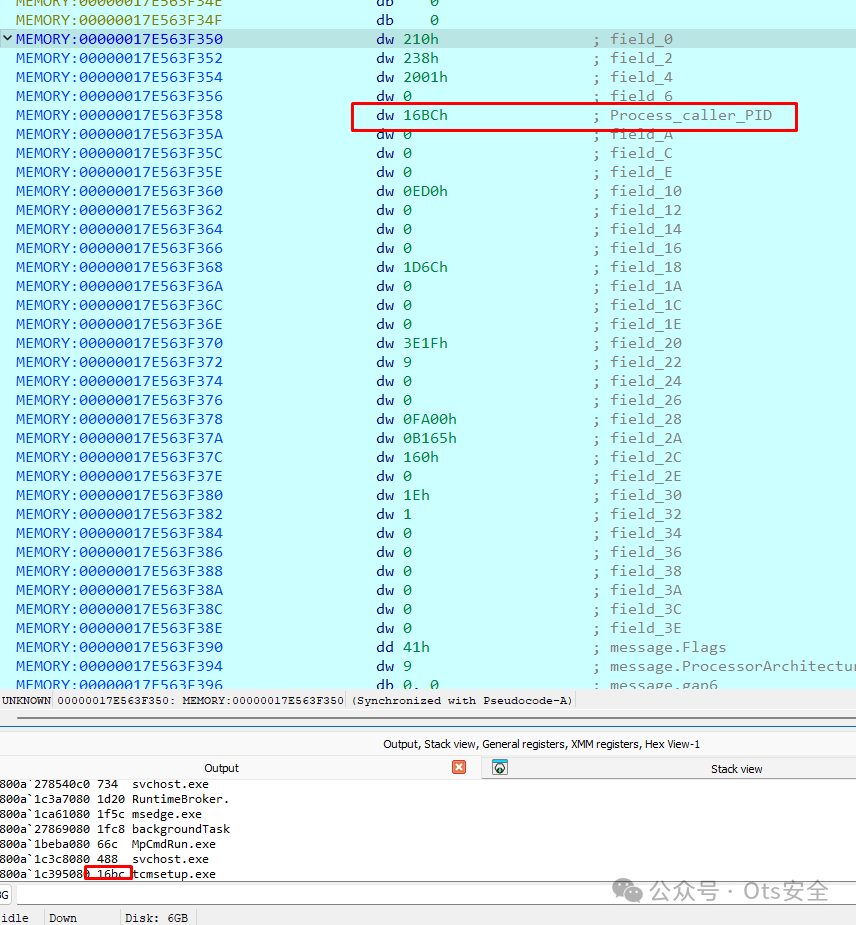 R15具有调用者 TCMSETUP 的RID = 0x3000,并且缓冲区存储了CTFMON进程的RID=0x3000。