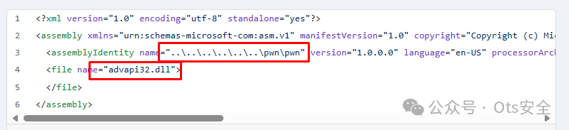 上面提到的 URL 中包含一些旧漏洞利用的 Manifest 文件示例,例如,欺骗系统从攻击者通过 PATH TRAVERSAL 技术到达的受控目录中加载库 advapi32.dll。