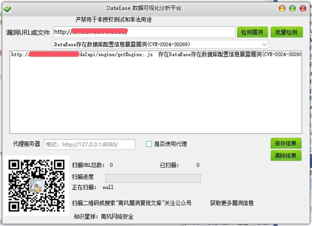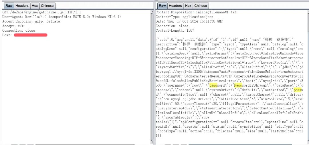 DataEase是一个开源的数据可视化分析工具。用于帮助用户快速分析数据并洞察业务趋势,从而实现业务的改进与优化。DataEase 2.5.0之前版本存在安全漏洞。攻击者利用该漏洞通过浏览器访问“/de2api/engine/getEngine;.js”路径,可以看到返回的数据库配置。