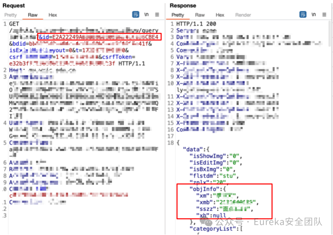 访问里面的智慧学工系统,返回的是学生个人信息,里面的内容非常多,包括学生基本信息、家庭信息、交学费的银行卡信息、SFZ号码、手机号码、班级专业、文化成绩、宿舍信息等等,因为数据太多,我放截图的话打码不方便,所以这里就干脆不放截图了。用Burpsuite抓取这个页面的请求和响应数据包,发现有以下两个请求: