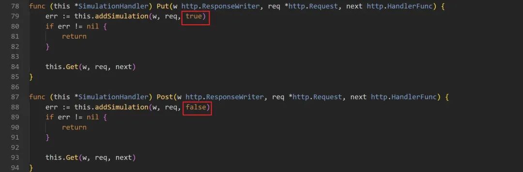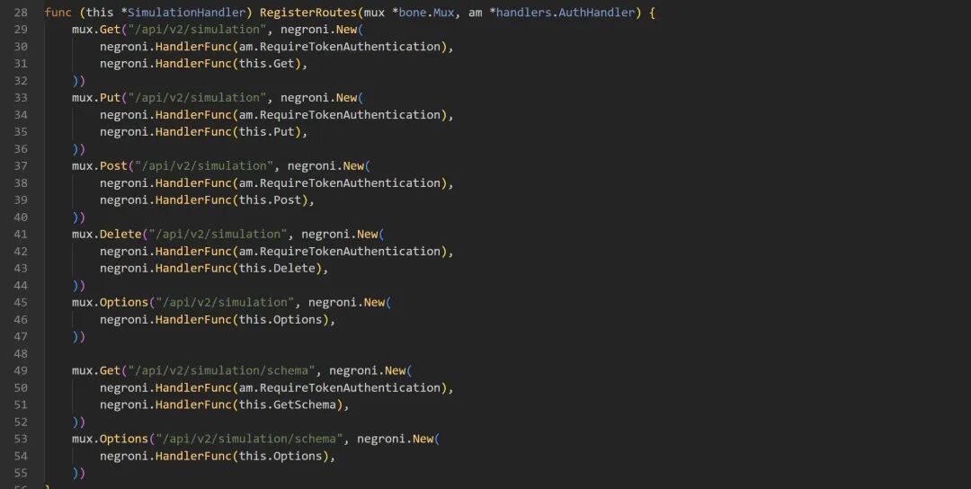 定义了 SimulationHandler 的路由注册方法,路由的每个 HTTP 方法(如 GET、PUT、POST、DELETE 等)都有一个对应的处理函数 (this.Get、this.Put、this.Post、this.Delete、this.Options、this.GetSchema)。这些函数处理实际的业务逻辑。