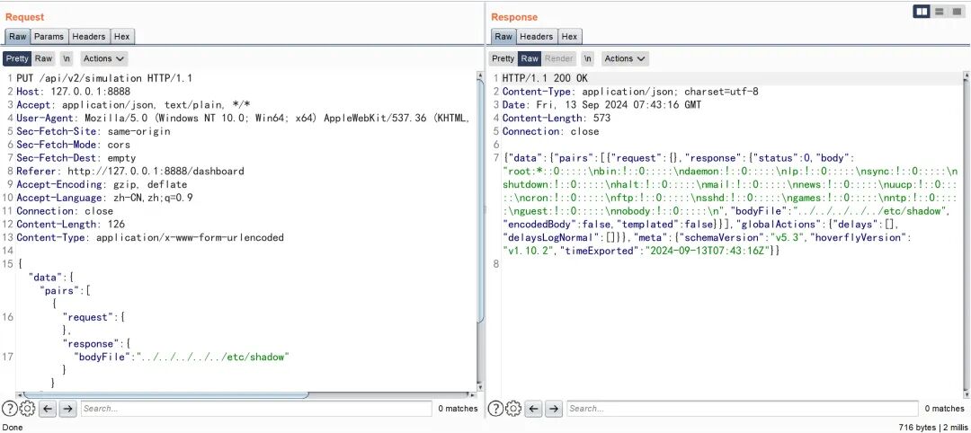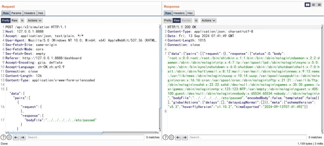 Hoverfly 是一个为开发人员和测试人员提供的轻量级服务虚拟化/API模拟/API模拟工具。其 /api/v2/simulation 的 POST 处理程序允许用户从用户指定的文件内容中创建新的模拟视图。然而,这一功能可能被攻击者利用来读取 Hoverfly 服务器上的任意文件。尽管代码禁止指定绝对路径,但攻击者可以通过使用 ../ 段来逃离 hf.Cfg.ResponsesBodyFilesPath 基本路径,从而访问任何任意文件。