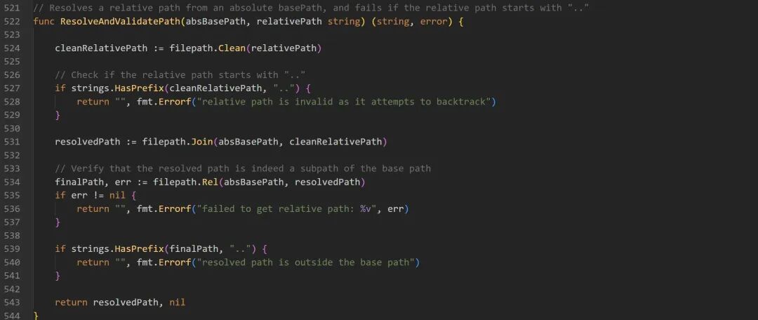 这个 ResolveAndValidatePath 函数用于从一个绝对路径(absBasePath)解析一个相对路径(relativePath),并验证这个相对路径是否合法。具体来说,它确保了相对路径不会尝试向上回溯(使用 “..”),并且解析后的路径仍然在基路径之下。