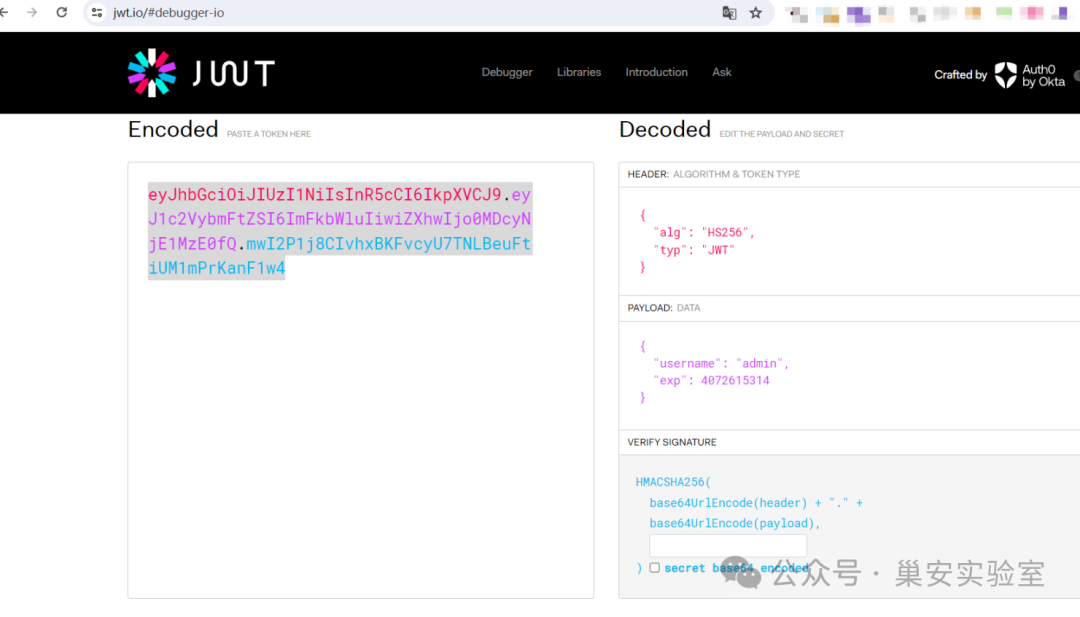 通过https://jwt.io/#debugger-io 构造绕过身份验证所需的Token: