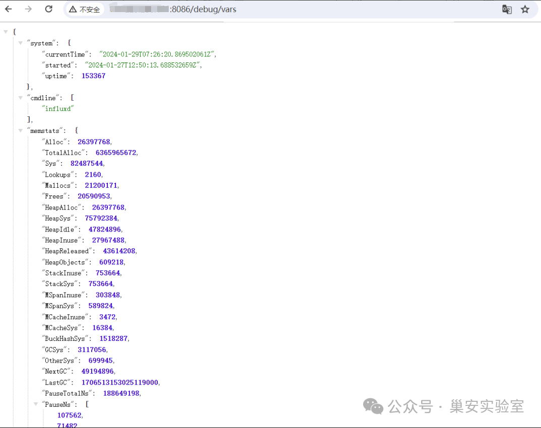 访问htp://IP:8086/debug/vars 查看系统的服务信息
