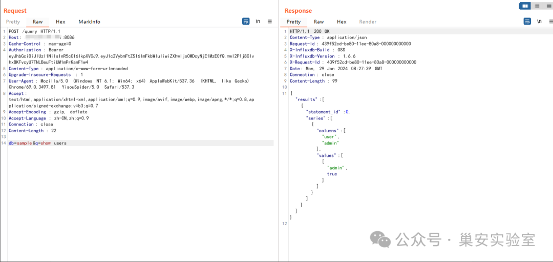 抓取/query页面的数据包,将请求方式修改为POST,添加以下请求字段: