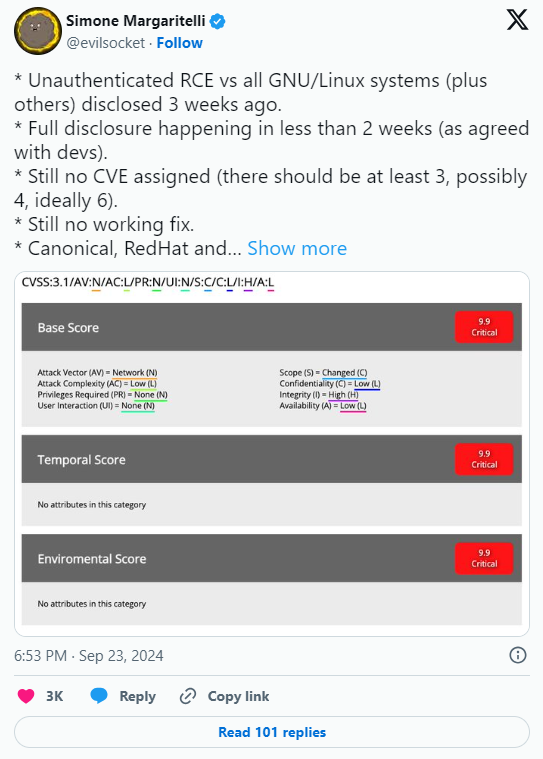 据外媒报道,最近一名叫Simone Margaritelli研究人员在Twitter/X上发出警告,称在Linux系统中发现了一个严重的安全漏洞。并表示这是一个影响所有Linux系统的CVSS 9.9级漏洞。
